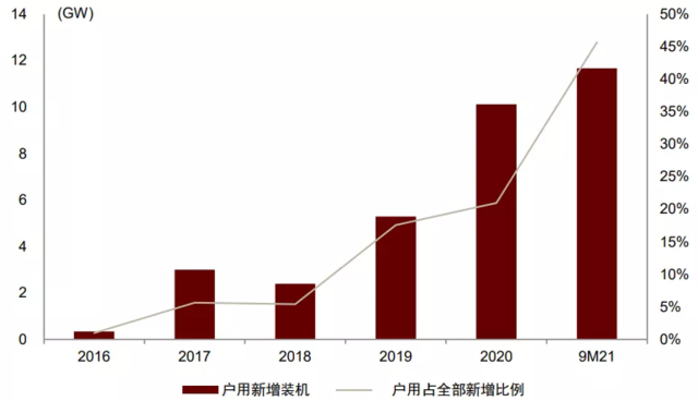 2016-9M21戶用光伏新增裝機及占整體新增裝機比例