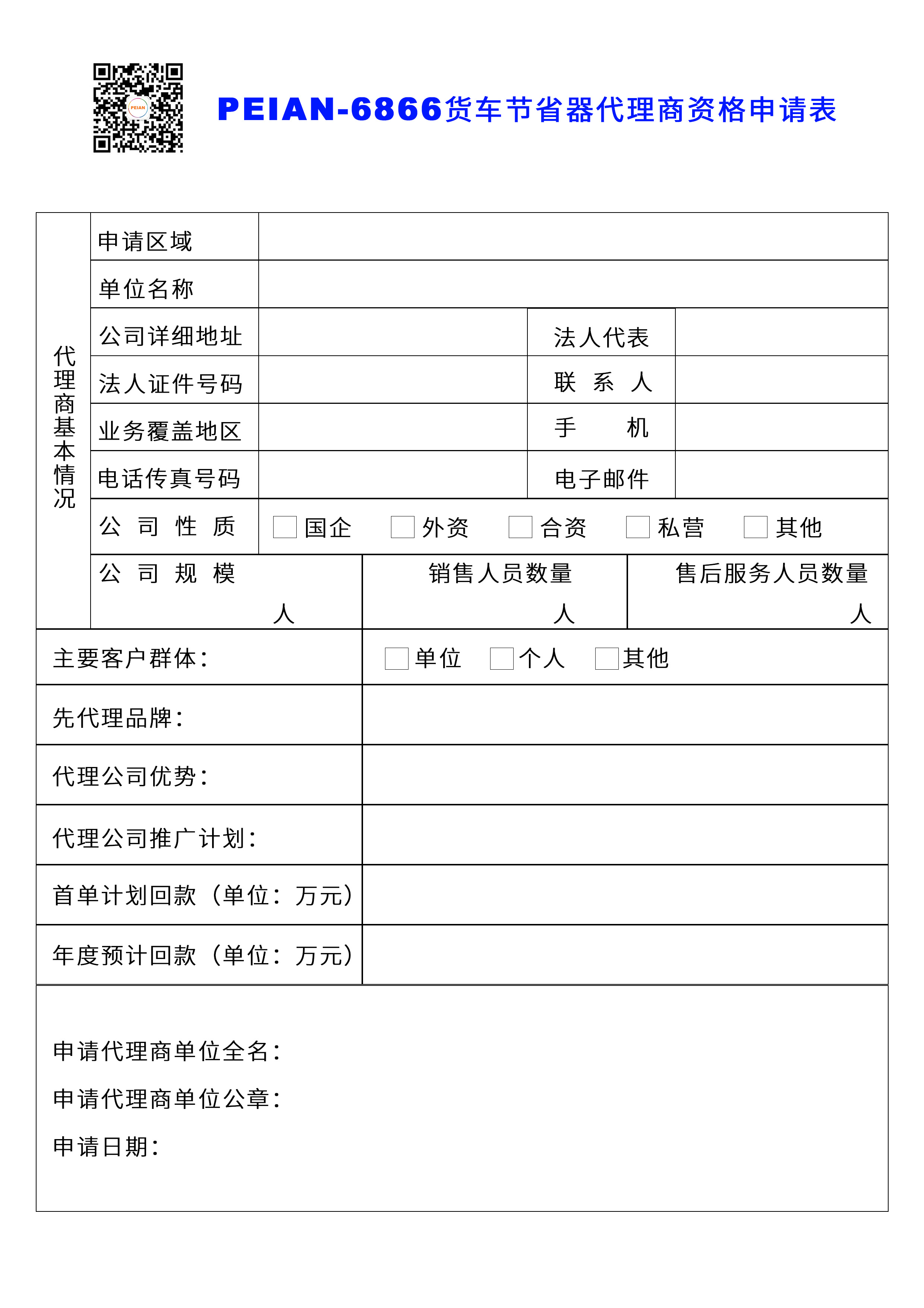 6866貨車節(jié)省器代理商資格申請表